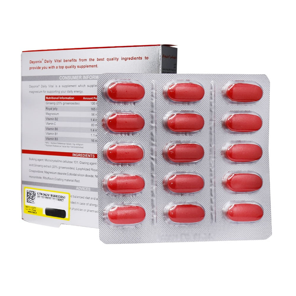قرص دیلی ویتال شامل ترکیبات جینسینگ، رویال ژلی، منیزیم، ویتامینهای گروه ب و ویتامین C سبب تقویت قوای جسمی و ذهنی و تقویت سیستم ایمنی میشود. این محصول نه تنها به آزادسازی انرژی در بدن بلکه با کمک منیزیم موجود در آن موجب افزایش مقاومت بدن در مقابل خستگی میشود.