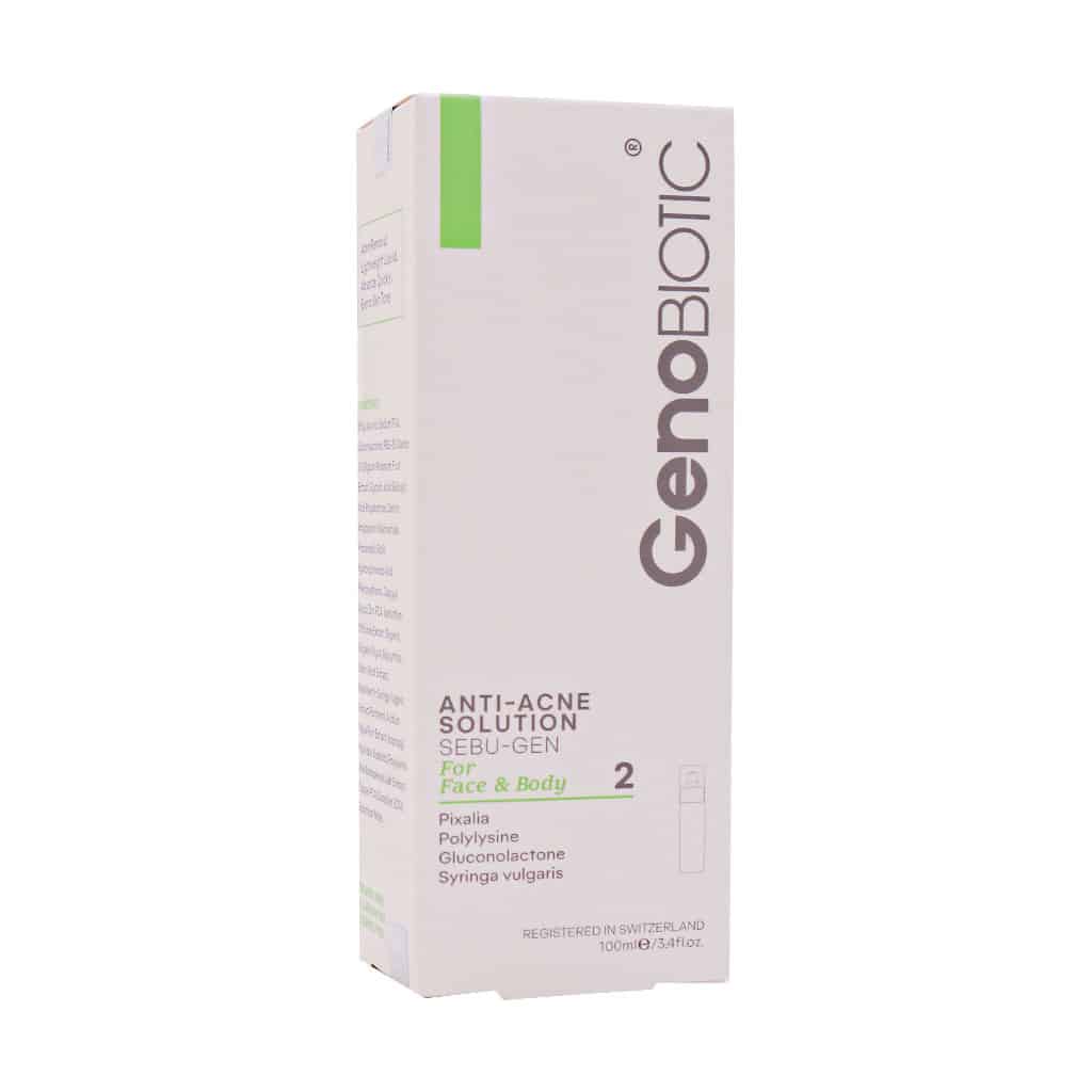 محلول صورت و بدن ژنوبایوتیک بر اساس ترکیبات گیاهی قرموله شده است که با بالا رفتن میزان سنتز آنتی بیوتیکهای طبیعی پوست سبب درمان آکنههای غیر التهابی (سر سیاه و سر سفید) در تمام نقاط بدن مانند
