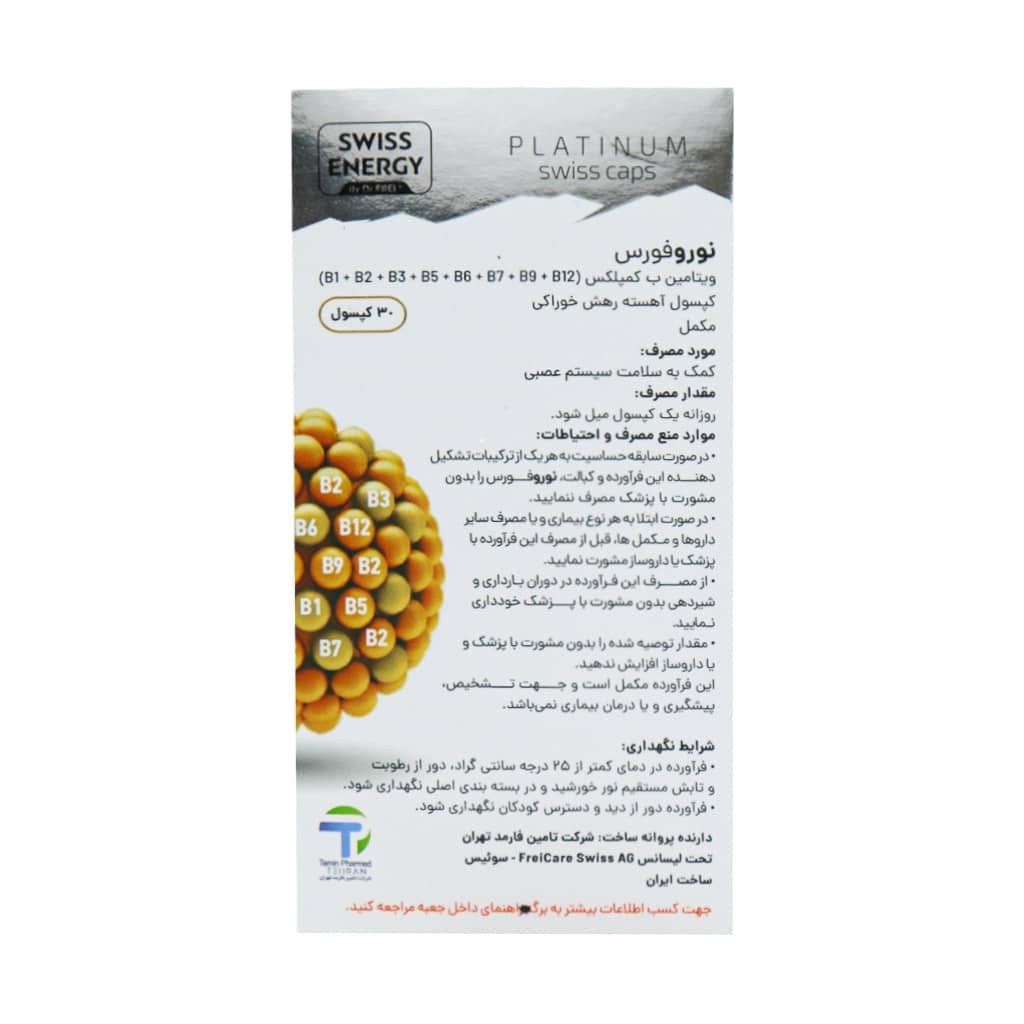 کپسول نوروفورس سوییس انرژی با فرمولاسیونی تخصصی شامل ویتامینهای تیامین، ریبوفلاوین، نیاسین، پانتوتنیک اسید، پیریدوکسین، بیوتین، فولیک اسید و سیانوکوبالامین، نیازهای روزانه بدن به این مواد مغذی را به طور کامل تأمین میکند.